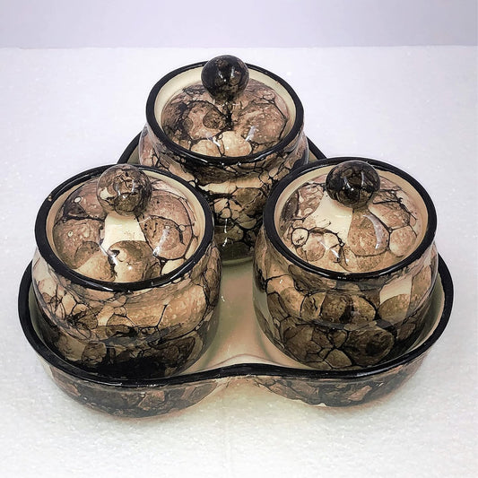 RAJ ROYAL Ceramic Storage Container Cainster Barni Jar with Lid & Tray. for pickle Chutney Tea Sugar Salt Spices - 200 Grams storage each, Set of 3,