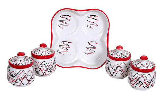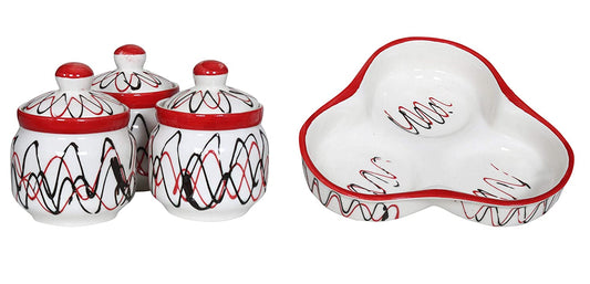 RAJ ROYAL Ceramic Food Storage Container with Lid & Tray - Set of 4-Storage Canister,Color - White & Red , Cornichon Jar - Size: Height 2.9" x Diameter : 2.9", Capacity-200 GM Each