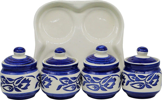 RAJ ROYAL Ceramic Food Storage Container with Lid & Tray - Set of 4-Storage Canister,Color - Blue , Cornichon Jar - Size: Height 2.9" x Diameter : 2.9", Capacity-200 GM Each
