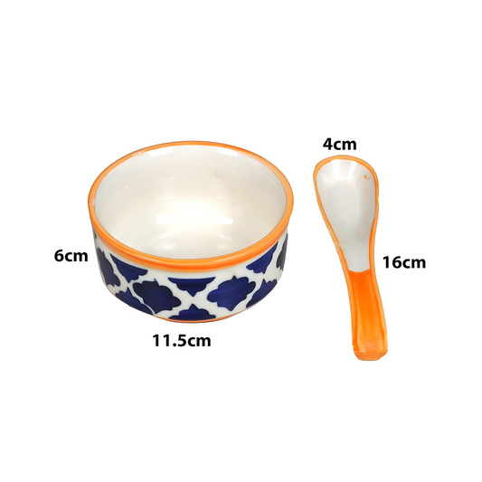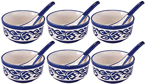 RAJ ROYAL Handmade Ceramic Hand Painted Blue Pottery Jumbo Soup Bowl and Spoons for Oats Noodles ceraluck Set of 6-350 ml Each