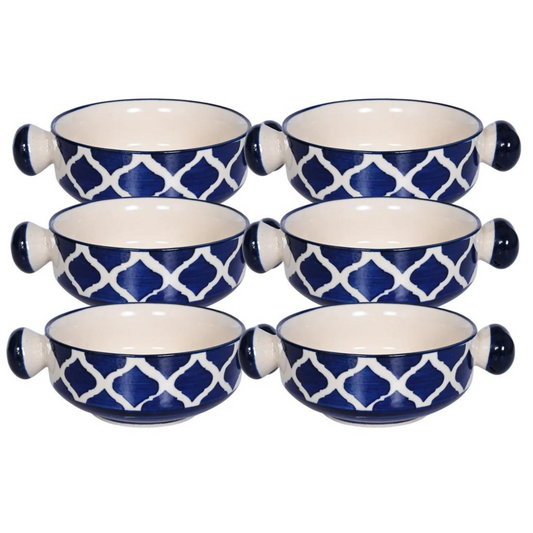 RAJ ROYAL Hand painted Blue Pottery Mughal Design Ceramic Soup Bowl with Handle - Set of 6 | Dessert Bowls | Cereal Bowls | Serving Bowls |Soup Bowls Set with Handle / Maggi Bowls (300 ML Each)