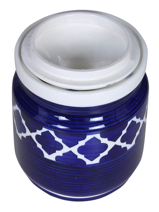 RAJ ROYAL Hand Painted Ceramic Cornichon Storage Jar for Pickle Dry items White Pottery Dry Food Storage Container Donga with Lid For Kitchen, Home - Multipurpose Storage Canister (Blue)